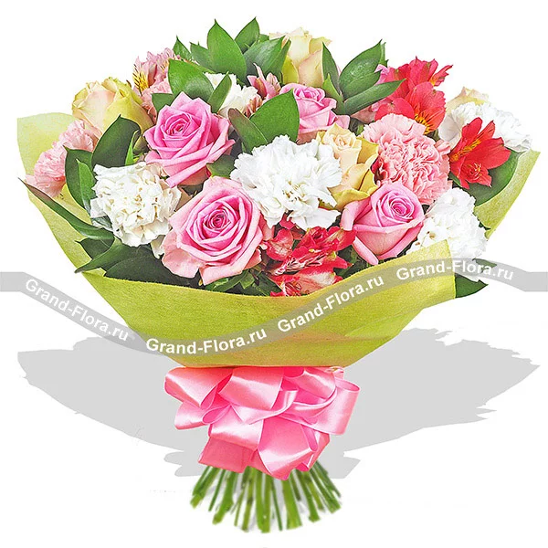 Стандартный (на фото): роза розовая - 5 шт., роза желтая - 4 шт., гвоздика розовая - 5 шт., гвоздика белая - 5 шт., альстромерия розовая - 1 шт., альстромерия красная - 2 шт.,