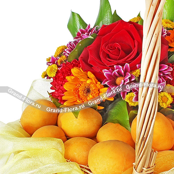 Стандартный: роза красная - 1 шт., гвоздика красная - 3 шт., гербера - 2 шт., хризантема фиолетовая - 1 шт., хризантема желтая (мелкоцветная) - 1, рускус - 2 шт., оазис, фетр желтый, корзина малая, абрикосы - 1,5 кг.